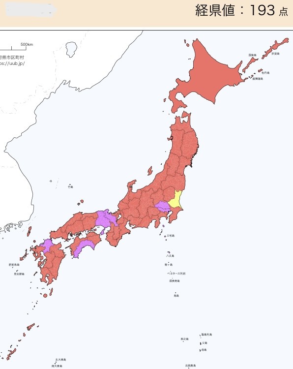 問2は難しいですね。「納得のあの県」と書きましたが、ヒントになったかどうか。私の“経県値アプリ”で一目瞭然(青は居住経験で赤が宿泊経験)。毎年の全県好感度調査で最下位争い常連のあの県にだけ私は宿泊経験がありません。そう、茨城県。納得でしょ?ご縁のある方ごめんなさい。